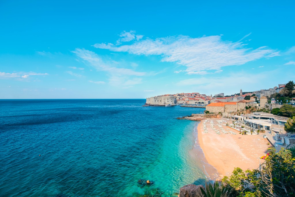 Banje Beach sits directly across from the Old Town and brings a different energy. It’s public, it’s busy, and it keeps you close to the action, with a clear view and an atmosphere that builds as the day goes on.