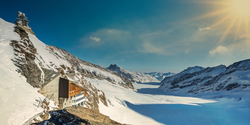 Standing at 11,332 feet above sea level, Jungfraujoch reveals a dramatic alpine world of snow, ice, and sweeping views, including the vast Aletsch Glacier and surrounding peaks. - Sphinx Observatory