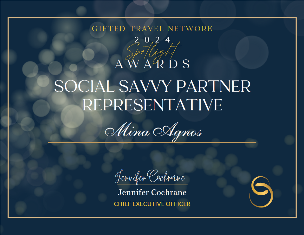 Mina Agnos of Travelive is honored — and beyond thrilled! — to be recognized as Social Savvy Partner Representative 2024 during Gifted Travel Network’s third annual End of Year Celebration!